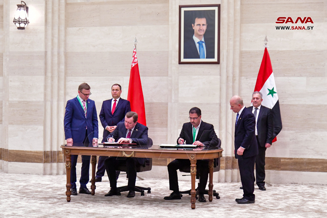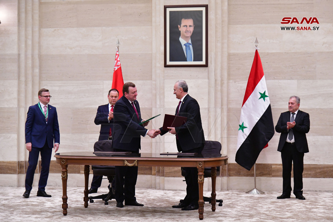 Damas –SANA/La Syrie et la Biélorussie ont signé six accords et mémorandums d’entente dans les domaines de l’échange commercial, de l’éducation, de l’habitat, du transport, de l’industrie et de la douane, et ce à l’issue des pourparlers officiels élargis tenus par le président du Conseil des ministres, Hussein Arnous, et le premier ministre de la République de Biélorussie, Roman Golovtchenko, et en présence des délégations des deux pays.
