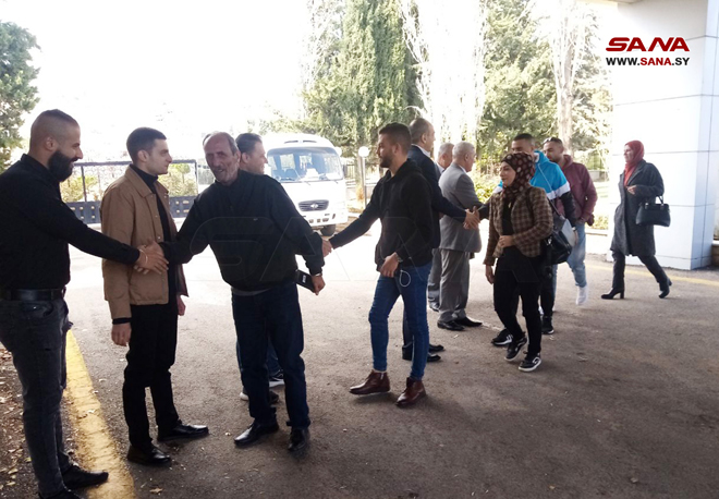 Banlieue de Damas-SANA/ Une délégation d’étudiants arabes est arrivée aujourd’hui au poste frontière de Jdeidet Yabous dans la banlieue de Damas, composée de 45 jeunes hommes et femmes (de l’Égypte, du Maroc, du Koweït, de l’Irak, du Yémen, du Liban, de la Palestine et de la Jordanie), et ce, en signe de confirmation de la solidarité de la jeunesse arabe avec les positions de la Syrie, direction et peuple.