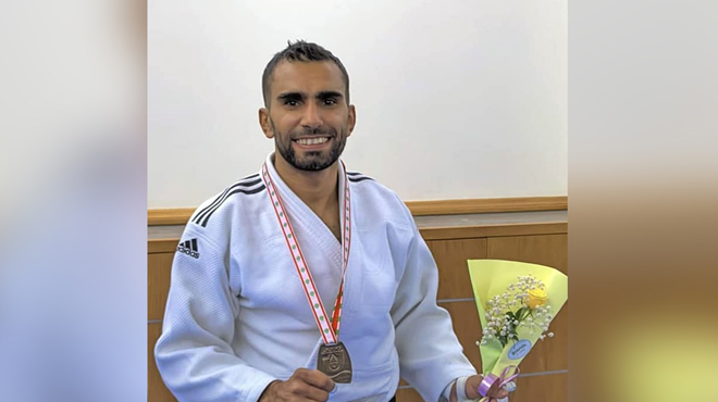 Le judoka de la sélection syrienne, Suleiman al-Rifai, remporte la médaille de bronze au Championnat d’Asie de judo, le 27-11-2022.