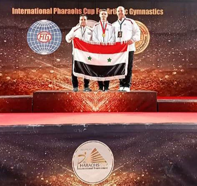 Le gymnaste de la sélection syrienne, Abdullah Tarrab, gagne la médaille d’or aux compétitions de saut de cheval à la Coupe internationale des pharaons, le 5-12-2022