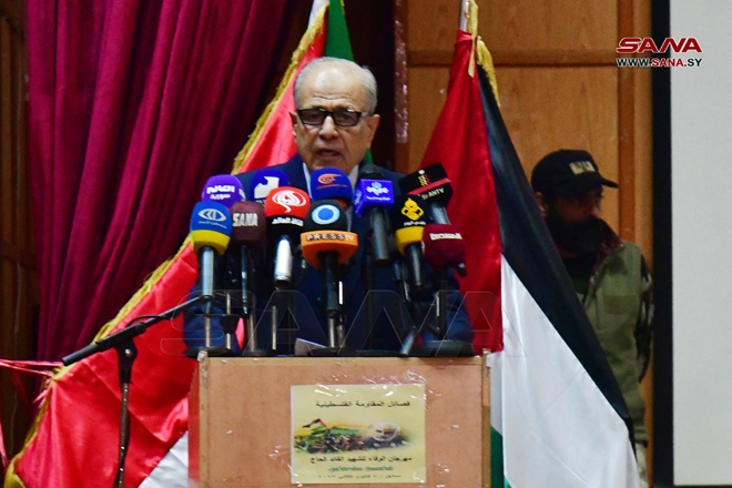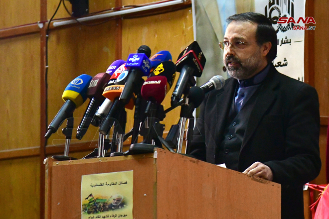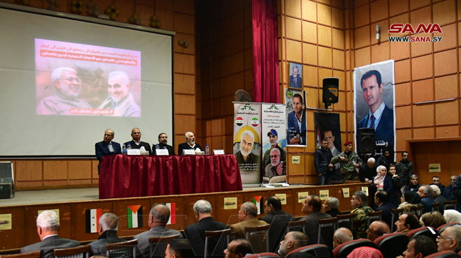 Damas-SANA/ Les factions de la résistance palestinienne ont commémoré aujourd’hui le 3ème souvenir du martyre du lieutenant-général, Qassem Soleimani, chef de la Force al-Qods, d’Abou Mahdi al-Muhandis, chef adjoint de l’Autorité irakienne de mobilisation populaire, et de leurs camarades, en organisant un festival rhétorique au Centre culturel arabe à Damas.