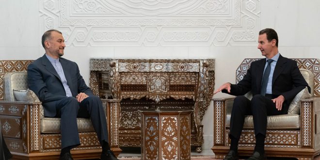 Damas-SANA/ Le président Bachar al-Assad a reçu cet après-midi le ministre iranien des Affaires étrangères, Hossein Amir-Abdollahian, et la délégation qui l’accompagne, et les deux parties ont souligné au cours des entretiens les relations étroites et historiques entre les deux pays et la coopération bilatérale existante dans divers domaines.