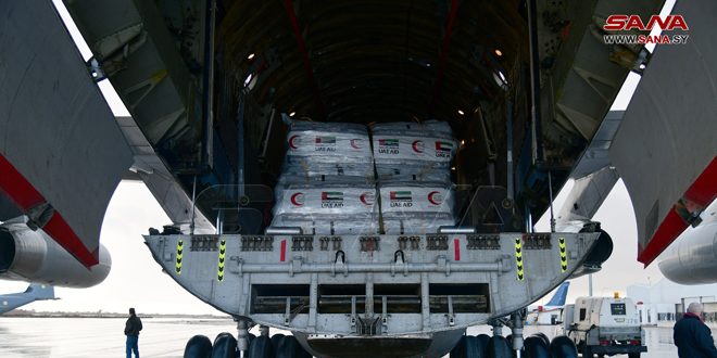 Damas-SANA/ Quatre avions (émirati, jordanien, indien et pakistanais) sont arrivés aujourd’hui à l’aéroport international de Damas, chargés de secours, de nourriture et d’aide médicale humanitaire pour les personnes touchées par le tremblement de terre.