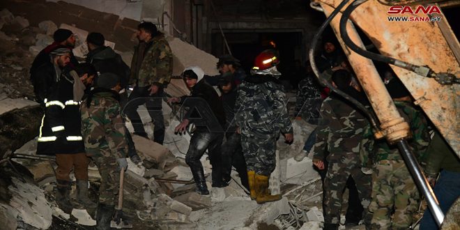 Banlieue de Damas –SANA/Les équipes de sauvetage ont poursuivi les opérations de recherche et l’enlèvement des décombres du bâtiment qui s’est effondré hier soir dans le quartier al-Zahlé à Harasta, dans la banlieue de Damas.