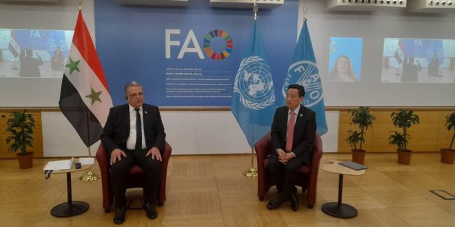 Rome –SANA/Le ministre de l’Agriculture et de la Réforme agraire, l’ingénieur Mohammad Hassan Qatana, et le directeur général de l’Organisation des Nations Unies pour l’alimentation et l’agriculture, « FAO » Qu Dongyu, ont examiné les moyens de coopération proposés dans la prochaine phase, et ce, en marge des réunions du la 46e session du Conseil des gouverneurs du Fonds international de développement agricole (FIDA), qui s’est tenue dans la capitale italienne, Rome.
