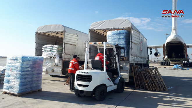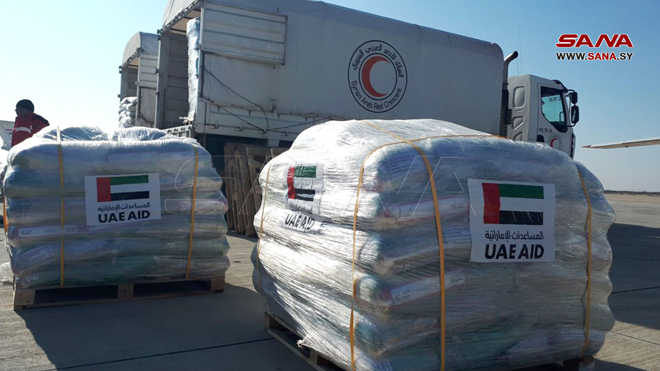 Le directeur de l’aéroport international de Damas, Bachar Ghafra, a indiqué que deux avions émiratis étaient arrivés aujourd’hui à l’aéroport de Damas, l’un transportant 87 tonnes et 720 kg de denrées et de couvertures, et l’autre 35 tonnes et 360 kg d’aides alimentaires.