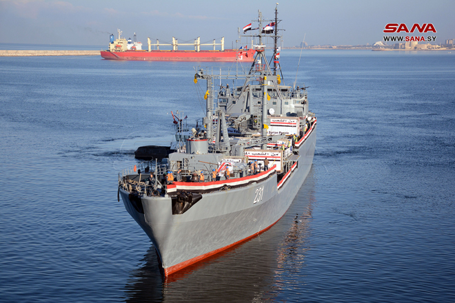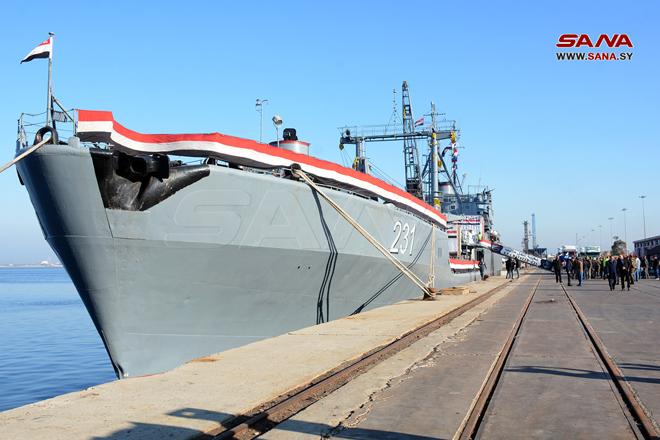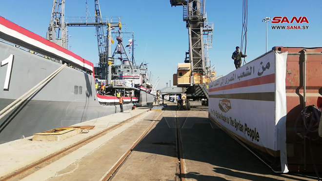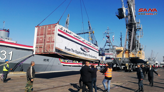 Lattaquié-SANA/ Un navire égyptien, chargé d’environ 500 tonnes de matériels alimentaires et médicaux, est arrivé aujourd’hui au port de Lattaquié pour soutenir les sinistrés.