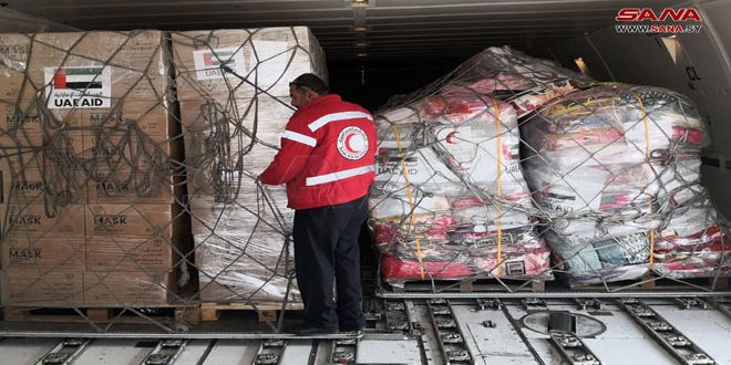 Damas –SANA/Un avion émirati est arrivé aujourd’hui à l’aéroport international de Damas transportant des aides de secours aux sinistrés du tremblement de terre.