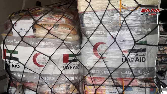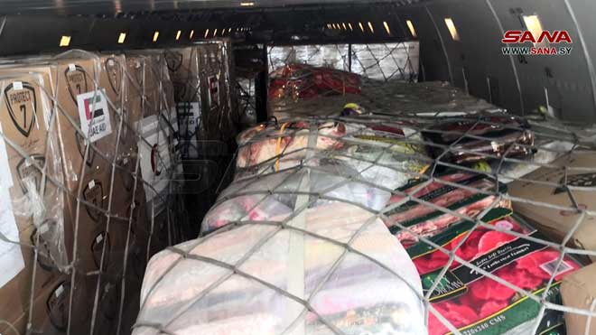 A l’aéroport international de Damas, le correspondant de SANA a indiqué qu’un avion d’aides émirati est arrivé ce matin transportant 99 tonnes et 360 kg de denrées et d’aides de secours, de vêtements, de couvertures.