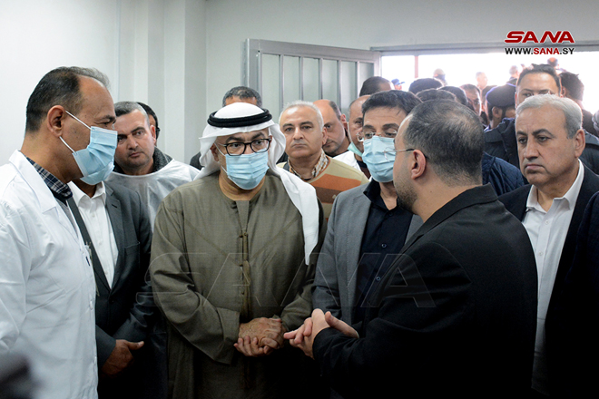Le ministre de la Santé des Émirats arabes unis Abdul Rahman Mohammed Al-Owais et le ministre de la Santé Hassan Ghabbach, inspectent les sites endommagés par le tremblement de terre à Jablé, le 21-2-2023