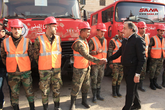 Au nom du président al-Assad… le gouverneur d’Alep rend hommage aux éléments du régiment des sapeurs-pompiers et de la Défense civile, le 28-2-2023
