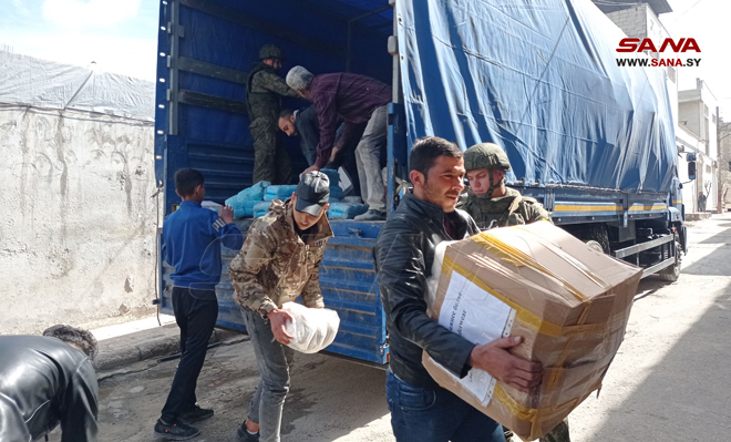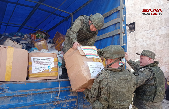 Alep –SANA/Un convoi d’aide russe est arrivé au quartier de Cheikh Maqsoud dans la ville d’Alep, composé de quatre camions contenant des denrées, des couvertures, des vêtements, et des tentes pour les sinistrés du tremblement de terre.