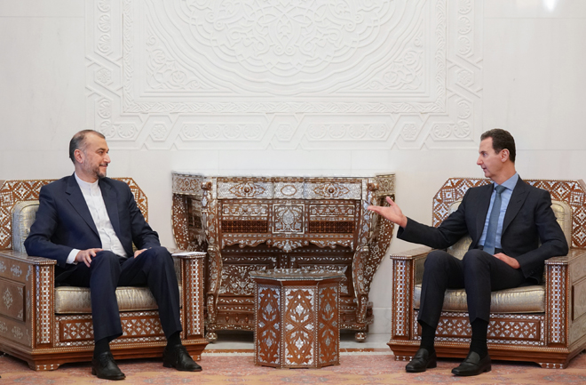 Le président Bachar al-Assad examine avec le ministre iranien des Affaires étrangères, Hossein Amir Abdollahian, les dossiers d’intérêt commun, le 9-3-2023