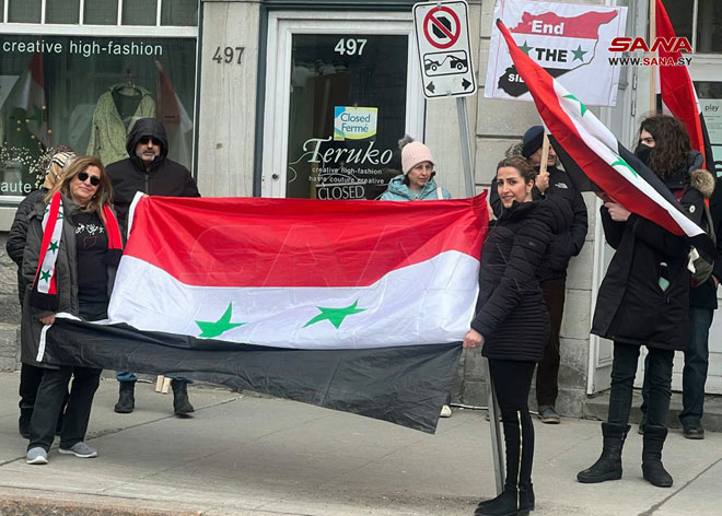 Ottawa – SANA / En poursuite de la campagne « levez le siège imposé à la Syrie », la ligue arabe à Ottawa a observé hier un sit-in de solidarité devant l’ambassade américaine à Ottawa pour appeler à la levée des mesures coercitives imposées à la Syrie.