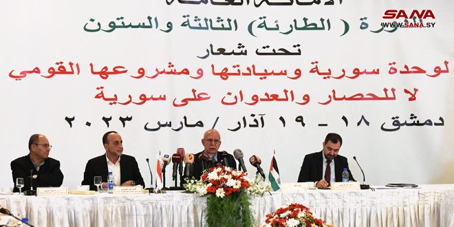 (La déclaration de la Syrie) intervient à l’issue de la réunion qui s’est tenue ces deux derniers jours à Damas sous le slogan “Oui à l’unité, à la souveraineté et au projet national de la Syrie.. Non à l’embargo et à l’agression contre la Syrie”, avec la participation de représentants de 135 partis arabes à la conférence, de Palestine, Jordanie, Bahreïn, Yémen, Égypte, Mauritanie et Tunisie, Algérie, Soudan et Liban, en plus de la Syrie.
