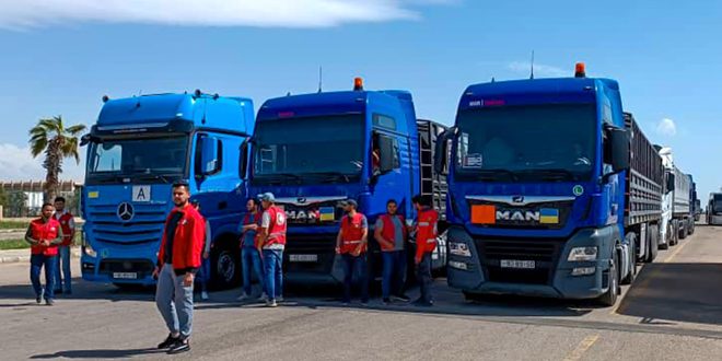 Daraa –SANA/Un convoi d’aide jordanien portant à bord de différents matériels de secours est entré aujourd’hui via le poste-frontière, Nassib, pour les personnes touchées par le tremblement de terre.