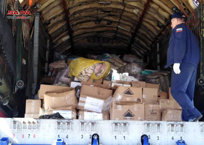 Lattaquié – SANA / Un avion appartenant au ministère russe des Situations d’urgence est arrivé cet après-midi à l’aéroport de Hmeimim à Lattaquié, avec à bord environ 18 tonnes d’aide humanitaire offerte par l’ambassade syrienne à Moscou.