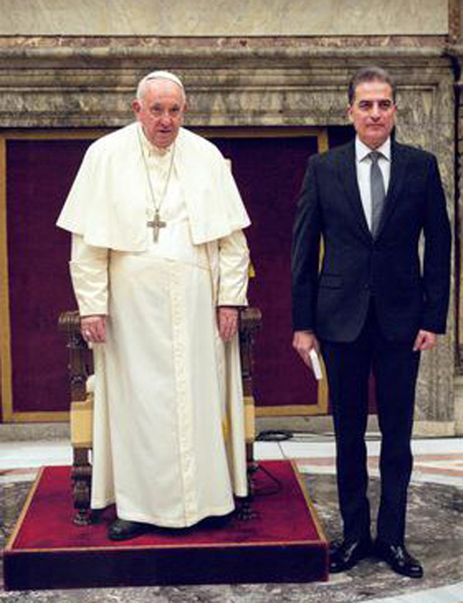 Cela est survenu lors de la réception par le Pape du Vatican des lettres de créance de Louay Fallouh, ambassadeur plénipotentiaire et extraordinaire de la République arabe syrienne auprès du Vatican, où le Pape François a transmis ses salutations au président Bachar al-Assad par l’intermédiaire de l’ambassadeur Fallouh.