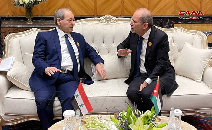 Djeddah-SANA/ Avant la tenue de la réunion des ministres des Affaires Étrangères préparatoire au Sommet arabe à Djeddah, le ministre des Affaires étrangères et des Expatriés, Dr Fayçal Al-Miqdad, a rencontré ses homologues jordanien, Ayman Al-Safadi, libanais Abdallah Bou Habib, omanais Badr bin Hamad Al-Busaidi, tunisien Nabil Ammar, djiboutien Mahamoud Ali Youssouf, ainsi que le ministre d’État au sein du ministère émirati des Affaires étrangères, Khalifa Shaheen Al-Marar.