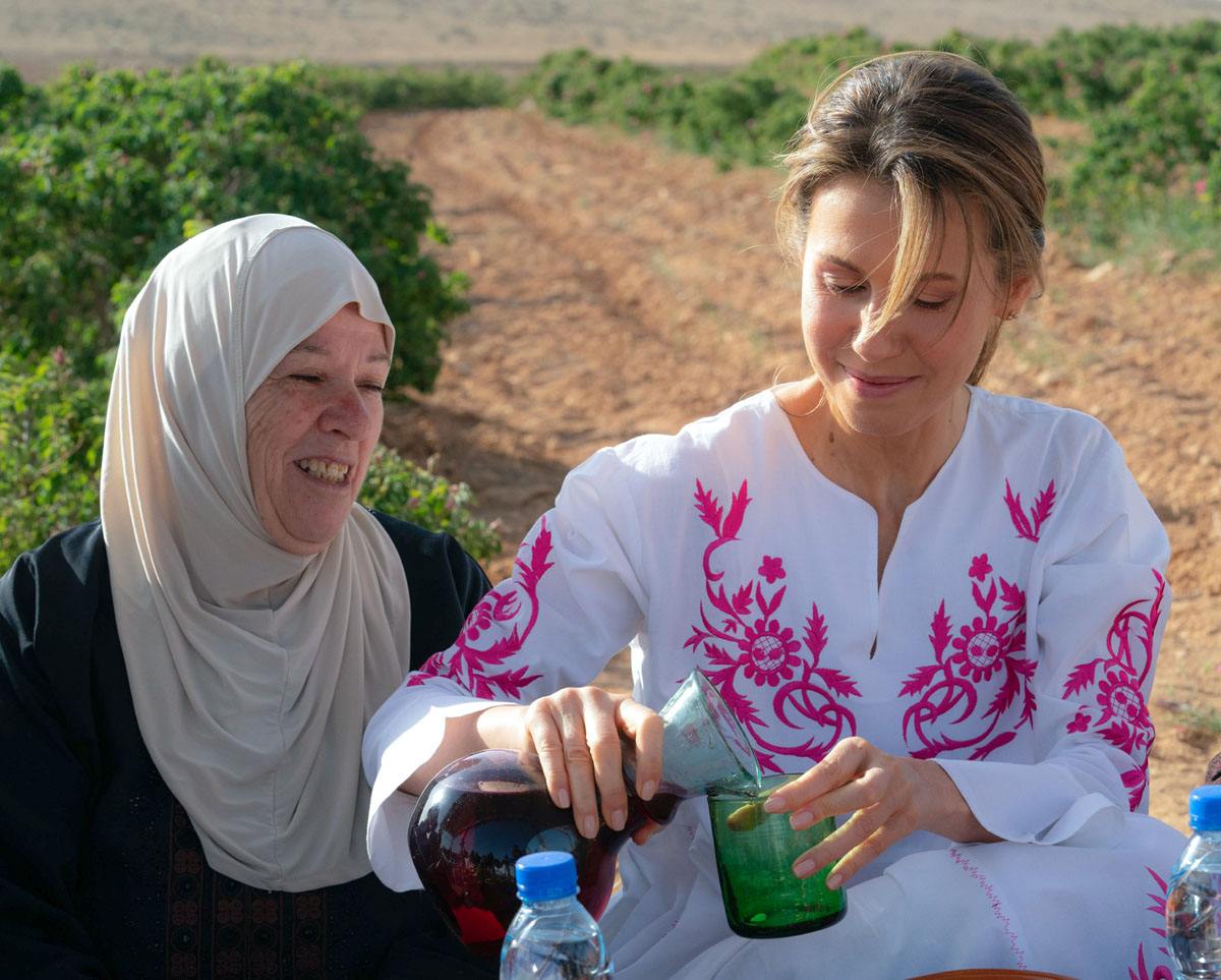 Mme Asma al-Assad a participé aujourd’hui avec les habitants d’al-Marah à la récolte de la Rose damascène, le rituel de la récolte chaque année est témoin sur l’importance sociale et culturelle indéfectible de la Rose damascène pour ceux qui préservent et protègent ce patrimoine.