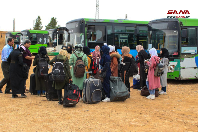 Alep – SANA / Le premier groupe d’étudiantes de la classe de 3e est arrivé aujourd’hui à Alep, en provenance des zones contrôlées par les réseaux terroristes via le poste de Tayha, dans la banlieue d’Alep, pour passer l’examen de brevet, en collaboration entre le Centre de coordination russe, le gouvernorat d’Alep et un certain nombre d’organisations concernées dans le gouvernorat.