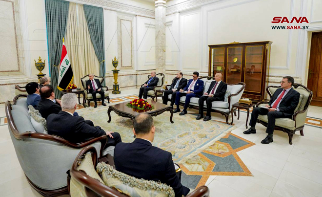 C’était lors de la réception du président Rachid au palais de Bagdad aujourd’hui, le ministre des Affaires étrangères et des Expatriés, Dr Fayçal Miqdad, a transmis les salutations du président Bachar al-Assad au président Rachid et au peuple irakien.
