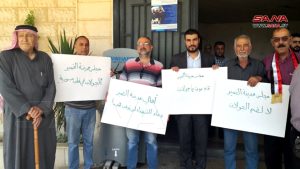 Gouvernorats-SANA/Des personnalités civiles, religieuses, officielles, partisanes, de jeunesse et syndicales dans les gouvernorats de Soueidaa, Daraa et Quneitra ont observé aujourd’hui un sit-in de solidarité avec nos compatriotes au Golan syrien occupé, dénonçant les agressions brutales de l’occupation israélienne et sa tentative de s’emparer de leurs territoires.