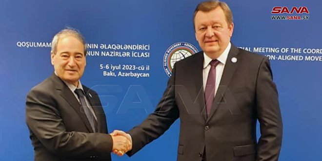 Damas-SANA/ Au deuxième jour de sa participation à la réunion des ministres des Affaires étrangères des pays non alignés tenue dans la capitale azerbaïdjanaise, Bakou, le ministre des Affaires étrangères et des expatriés, Dr Fayçal Miqdad, a rencontré le ministre des Affaires étrangères du Nicaragua, Denis Moncada Colindres.