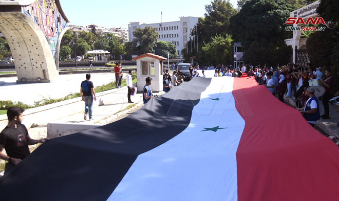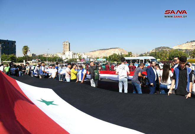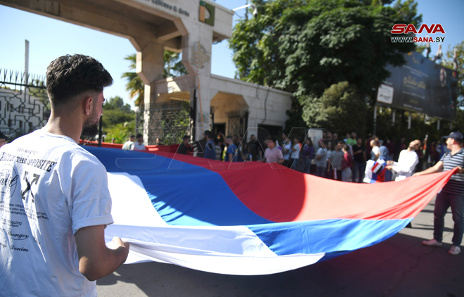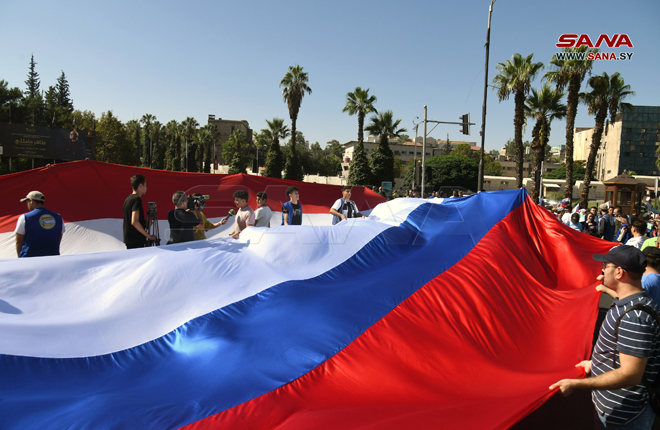 Les participants ont affirmé leur solidarité et leur soutien à la Russie, qui a soutenu la Syrie dans sa guerre contre le terrorisme, notant que la levée du drapeau à cette occasion adresse un message d’amour et de remerciement au peuple russe pour ses positions de soutien.