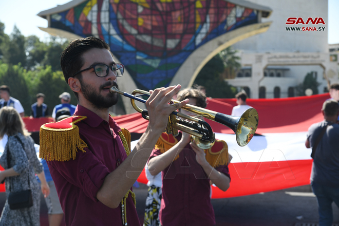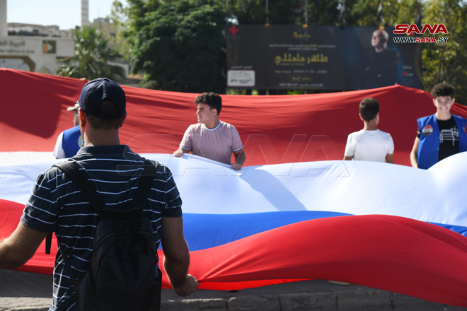 Damas-SANA / À l’occasion de la Journée du drapeau russe, des personnalités juvéniles et culturelles ont participé aujourd’hui à la célébration de la levée du drapeau russe sur la place des Omeyyades à Damas.