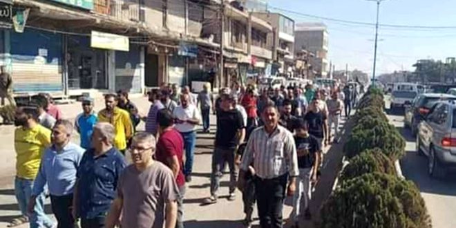 Hassaké-SANA/ Des manifestations de protestation ont eu lieu contre la milice séparatiste des « FDS » dans le village de Ma’abda, situé dans la région de Malikiyah, dans la banlieue de Hassaké, au nord-est du pays, pour dénoncer les pratiques de la milice des « FDS » liées à l’occupation américaine et la poursuite et l’enlèvement des habitants pour les engager dans des combats dans ses rangs.