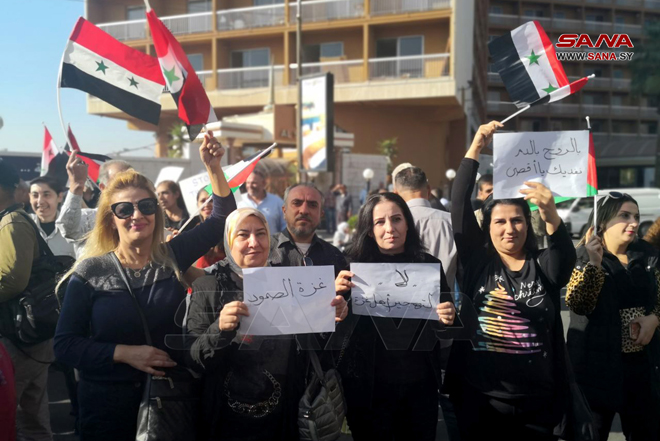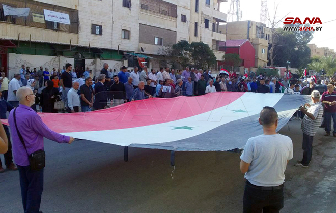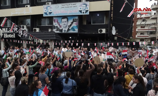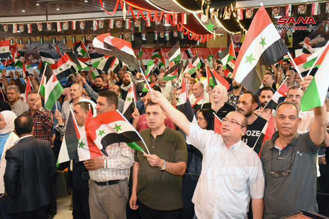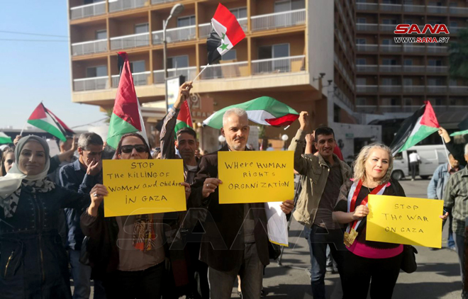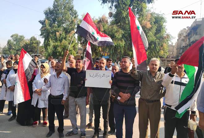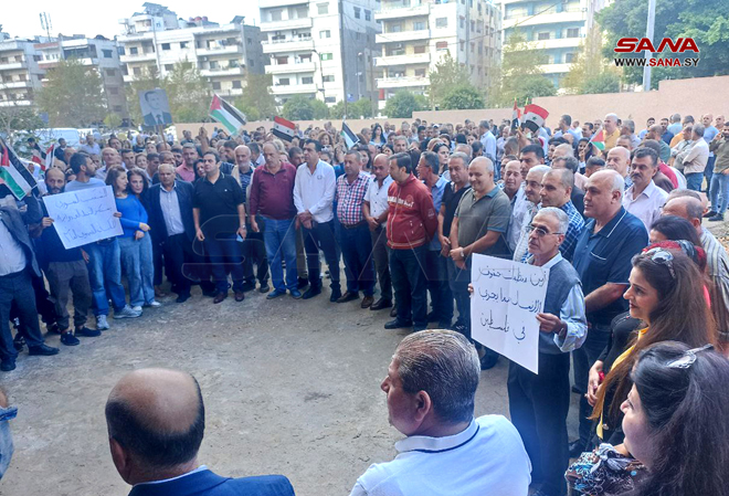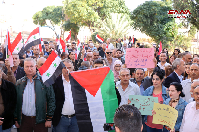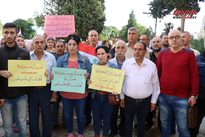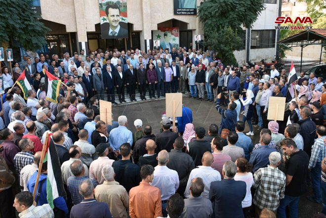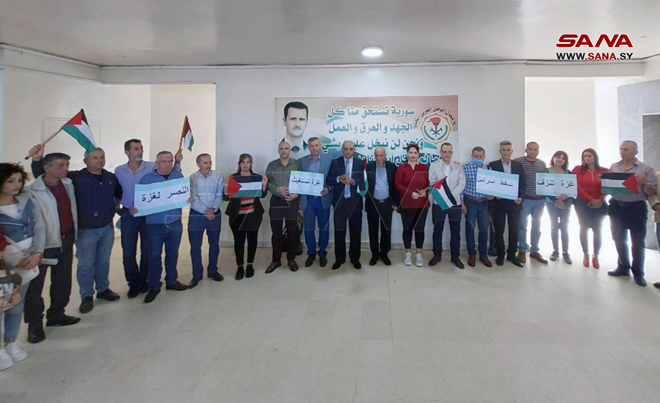 Gouvernorats-SANA / La Fédération générale des syndicats des ouvriers dans les différents gouvernorats a observé aujourd’hui un sit-in de solidarité en soutien au peuple et à la résistance palestinienne, et de dénonciation et de rejet des crimes de l’occupation israélienne contre les civils dans la bande de Gaza et dans tous les territoires arabes occupés.