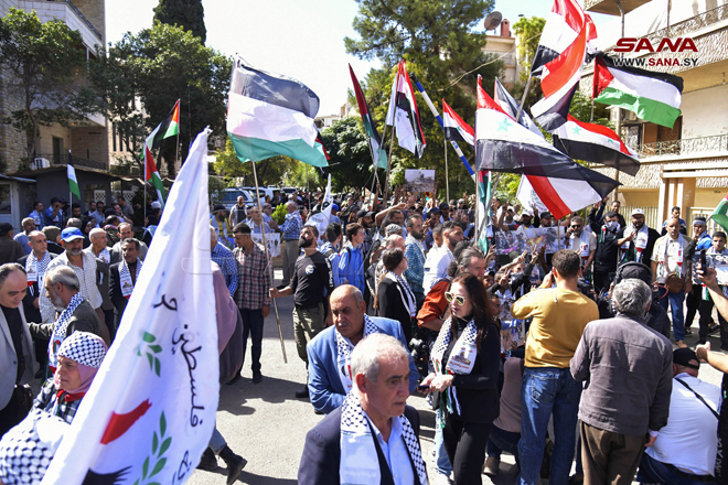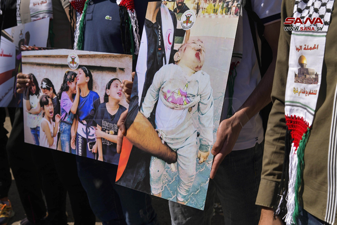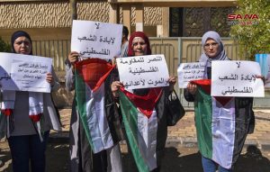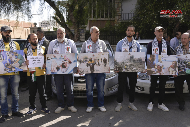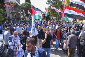 Damas-SANA/ Le Comité populaire arabe syrien pour le soutien au peuple palestinien et la résistance au complot sioniste, en coopération avec la Fondation internationale Al-Qods-Syrie et les factions palestiniennes a observé aujourd’hui un sit-in de solidarité devant le siège de l’ONU à Damas, pour soutenir le peuple palestinien et dénoncer les crimes commis par l’occupant sioniste contre la population dans la bande assiégée de Gaza.