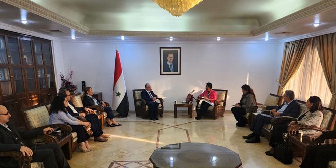 Damas-SANA/ Lors de sa rencontre tenue aujourd’hui avec la nouvelle représentante du Fonds des Nations Unies pour la population « FNUAP », Muriel Mafico, et la délégation qui l’accompagne, Dr Bassam Ibrahim, ministre de l’Enseignement supérieur et de la Recherche scientifique, a discuté des mécanismes d’exécution de la coopération dans les domaines scientifiques, médicaux et de formation, et du soutien aux recherches scientifiques.