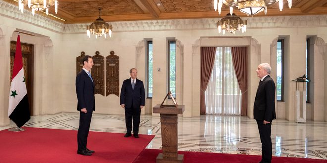 Damas-SANA/ Devant le président Bachar al-Assad, Ayman Soussane a prêté aujourd’hui serment en tant qu’ambassadeur de la République arabe syrienne auprès de l’Arabie Saoudite, et Maher Baddour a également prêté serment en tant qu’ambassadeur de Syrie auprès de la République algérienne démocratique et populaire.