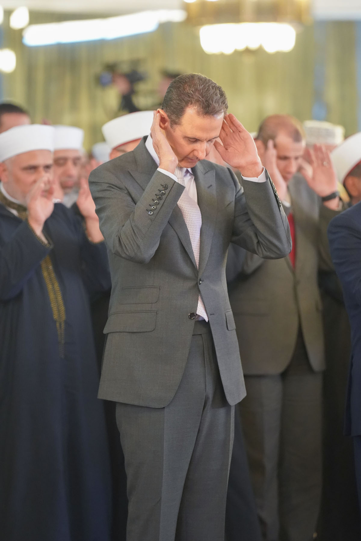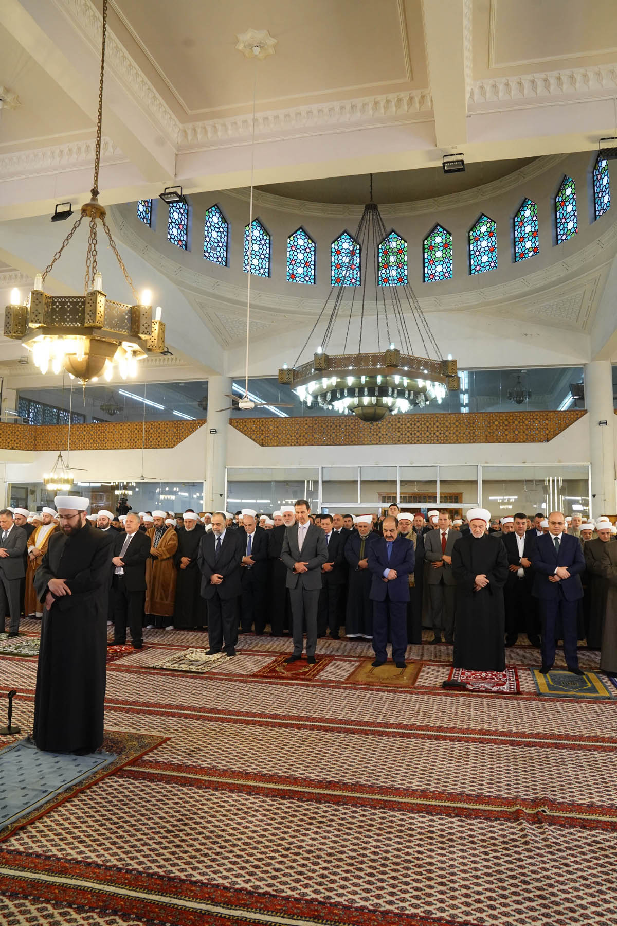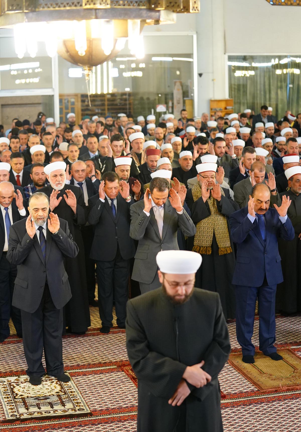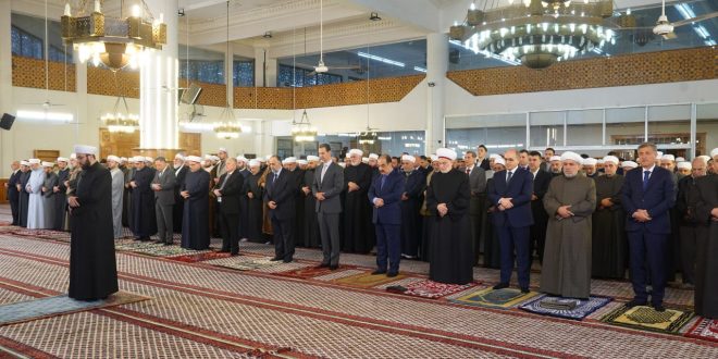Le ministre des Waqfs, nombre de responsables de l’Etat et du Parti, des membres de l’Assemblée du Peuple, des Oulémas et une foule de citoyens ont fait la prière avec le président al-Assad.