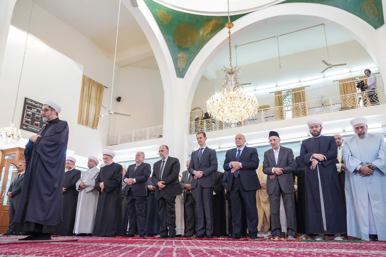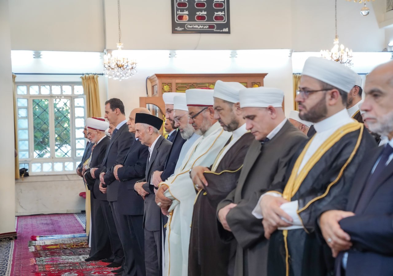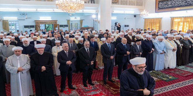 Le ministre des Waqfs, Dr Abdul Sattar al-Sayyed, nombre de hauts responsables de l’Etat et du Parti, des Oulémas et une foule de citoyens ont fait la prière avec le président al-Assad.