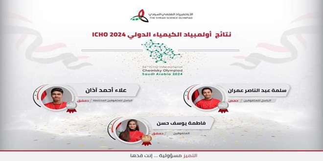 Damas-SANA/ Les élèves de l’Olympiade scientifique syrienne ont remporté deux médailles d’argent et une médaille de bronze dans l’Olympiade internationale de chimie 2024, qui a eu lieu en Arabie saoudite du 21 au 30 du mois en cours.