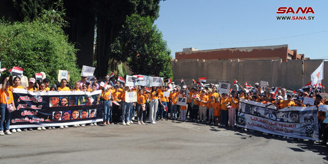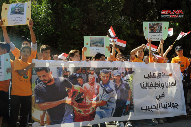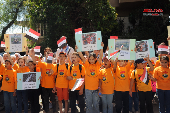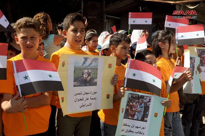 Damas-SANA/ Un nombre d’enfants syriens ont observé ce matin un sit-in de solidarité devant le siège des Nations Unies à Damas, en dénonciation du massacre commis par l’entité d’occupation israélienne contre les enfants et la population de Majdal Shams dans le Golan syrien occupé.