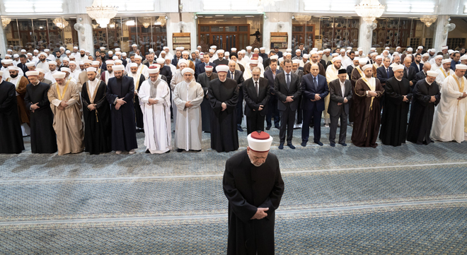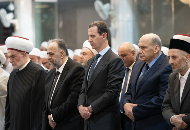 Damas – SANA / Le président Bachar al-Assad a participé à la cérémonie religieuse organisée hier soir par le ministère des waqfs pour commémorer la naissance du Prophète à la mosquée de Saad bin Moaz à Damas après avoir fait la prière de Maghreb.