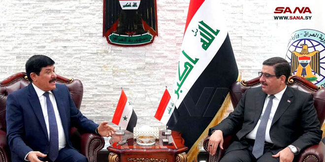 Bagdad-SANA/L’ambassadeur de Syrie à Bagdad, Sattam Jadaan Dandah, et le ministre irakien du Commerce, Daoud Dawood Al-Ghurairi, ont discuté des moyens d’activer la coopération syro-irakienne dans le domaine commercial et de coordonner les efforts pour soutenir les frères en Palestine et au Liban.