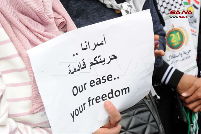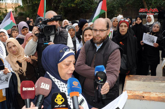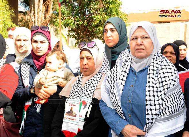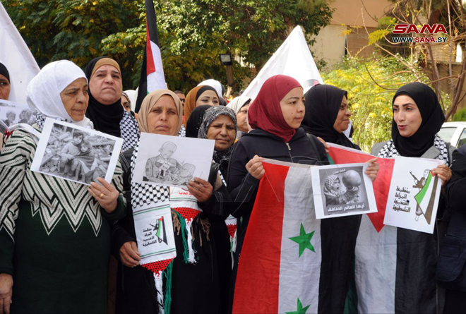 Damas-SANA/ L’Organisation progressiste des femmes palestiniennes a observé aujourd’hui un sit-in de solidarité devant le siège des Nations Unies à Damas, en soutien aux peuples palestinien et libanais face à la criminalité de l’entité sioniste dans la région, et en dénonciation de ses crimes, notamment contre les enfants et les femmes.