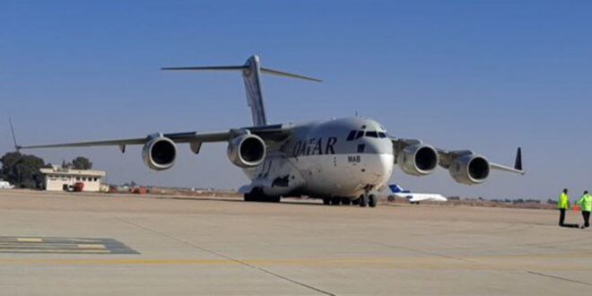 Damas-SANA/ Un avion chargé de 20 tonnes d’aides, dont des denrées alimentaires, est arrivé à l’aéroport international de Damas, fournies par le Fonds du Qatar pour le développement, dans le cadre du pont aérien de réponse d’urgence.