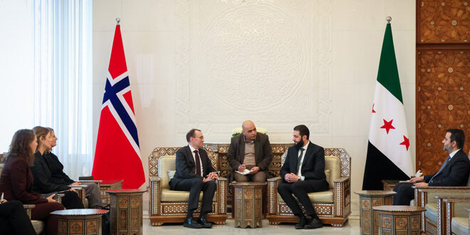 Damas-SANA / Le Dirigeant de la nouvelle administration syrienne, Ahmad al-Charaa, et le ministre des Affaires étrangères, Assaad al-Chaibani, ont rencontré à Damas la délégation du Royaume de Norvège, dirigée par le ministre des Affaires étrangères de Norvège Espen Barth Eide.