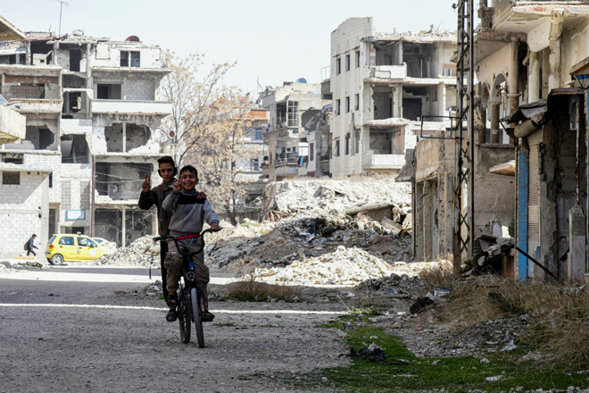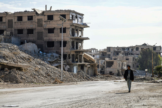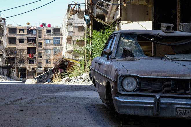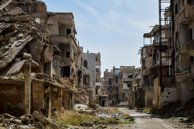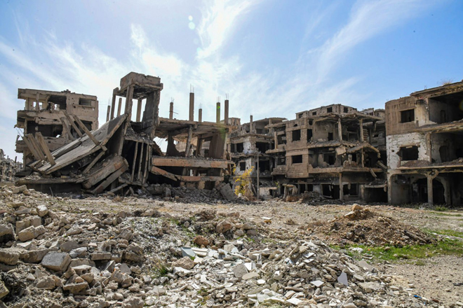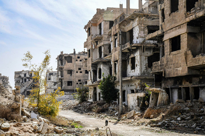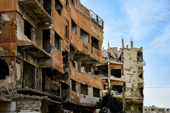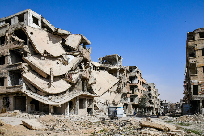 La destruction majeure à Harasta dans la banlieue de Damas du fait du bombardement du régime ancien