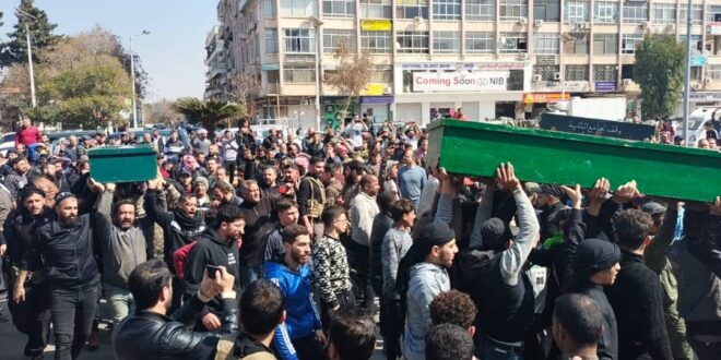 Hama – SANA / Aujourd’hui, des centaines d’habitants de Hama ont assisté aux funérailles de 5 corps de martyrs tombés lors d’une embuscade perfide tenue par les vestiges et milices du régime déchu dans zone côtière.