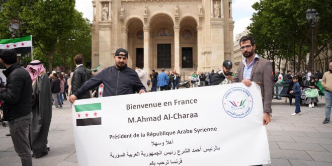 Paris-SANA / La communauté syrienne en France organise un rassemblement dans le centre-ville de Paris pour saluer la visite du président Ahmad al-Charaa et exiger la levée des sanctions imposées à la Syrie.