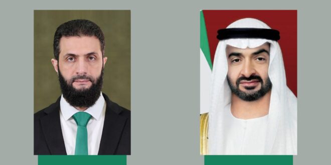 Damas-SANA/ Le président Ahmad Al-Charaa a eu aujourd’hui un appel téléphonique avec Son Altesse Cheikh Mohammed bin Zayed Al Nahyan, président des Émirats arabes unis, au cours duquel ils ont échangé leurs points de vue sur les derniers développements régionaux et discuté des perspectives de renforcement des relations bilatérales entre les deux pays dans divers domaines.