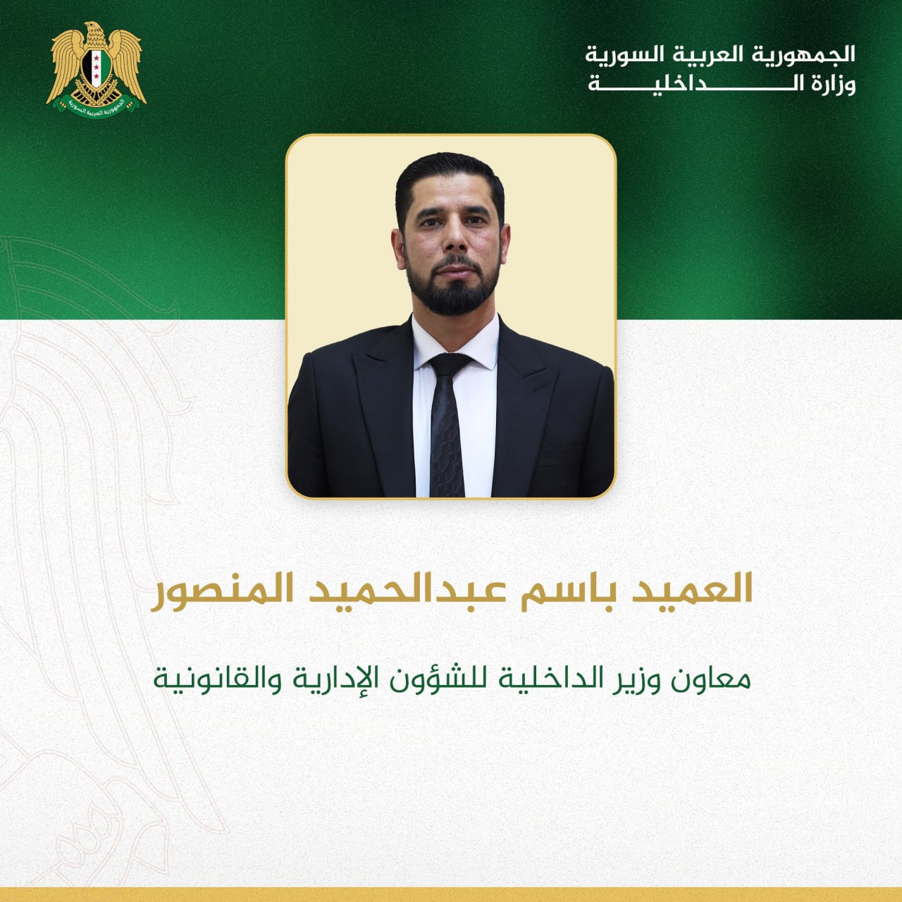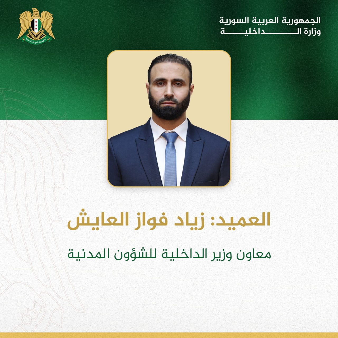 Le général Ziad Fawaz Al-Ayech est nommé ministre adjoint pour les affaires civiles et le général Bassem Abdul Hamid Al-Mansour est nommé ministre adjoint pour les affaires administratives et juridiques.