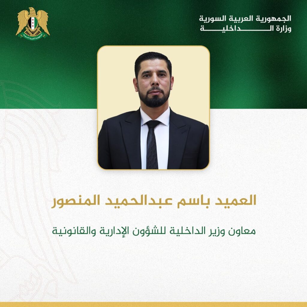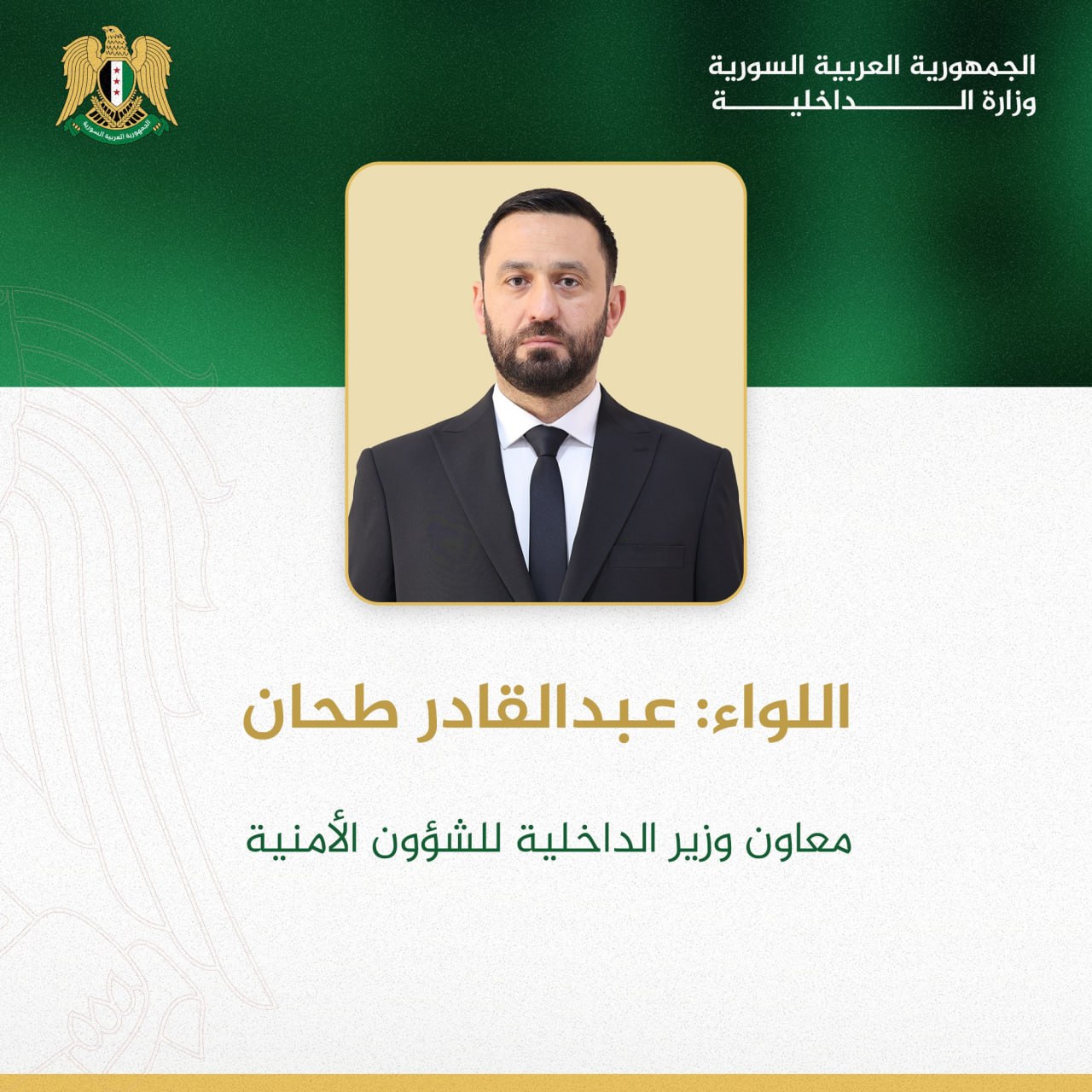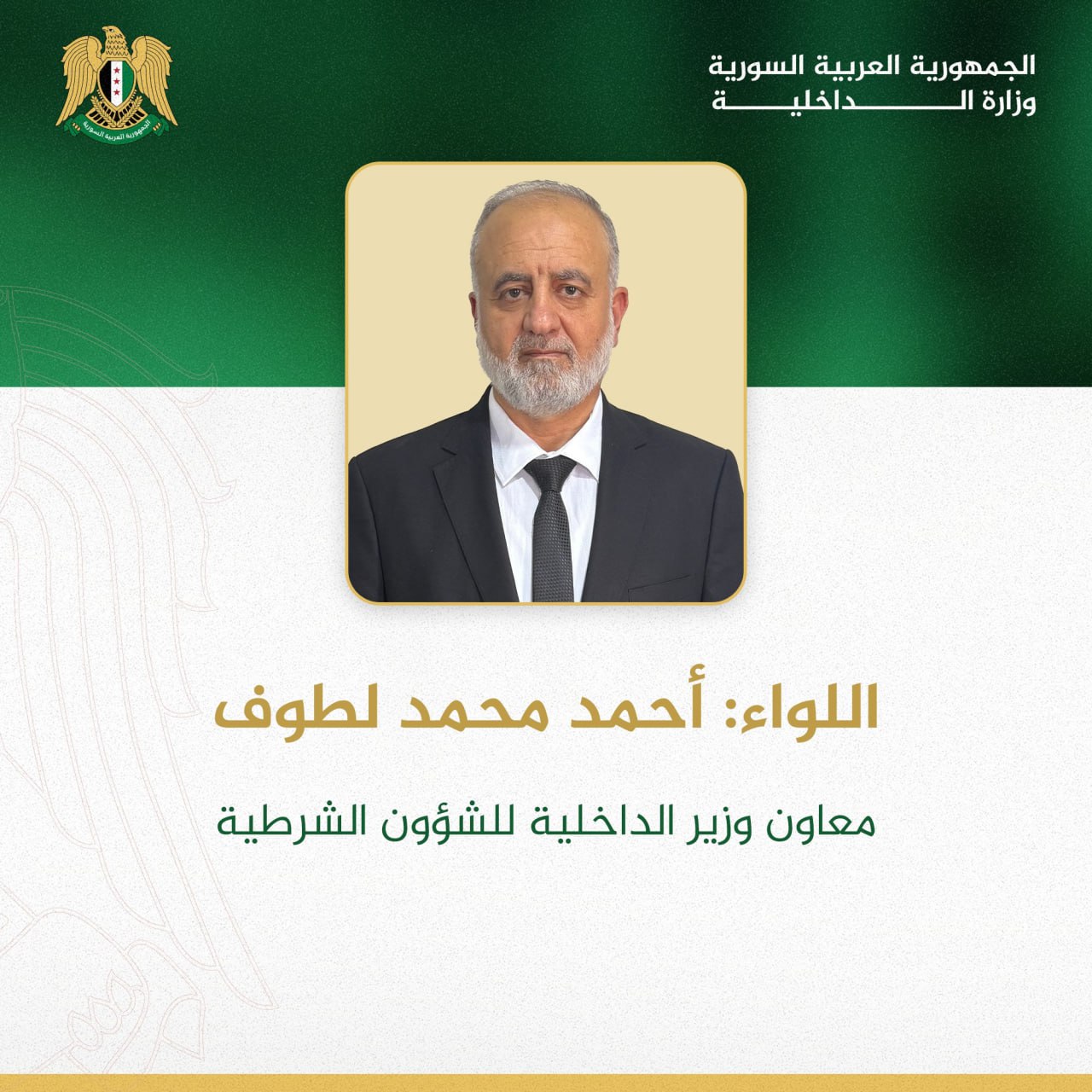 Damas-SANA / Le ministère de l’Intérieur a émis une décision portant nomination du général de division Abdul Qader Tahhan comme ministre adjoint de l’Intérieur pour les affaires de sécurité, du général de division Ahmad Mohammad Lattouf comme ministre adjoint pour les affaires de police.